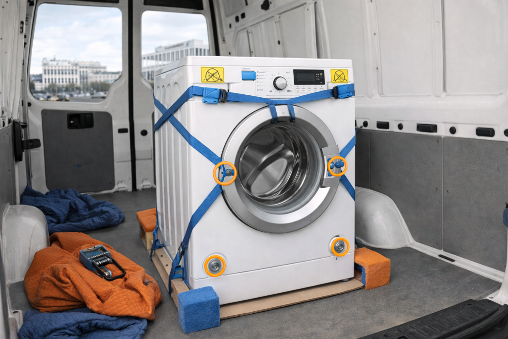 Стиральная машина — один из самых «коварных» грузов при переезде. Снаружи это просто тяжёлая коробка, но внутри — барабан на